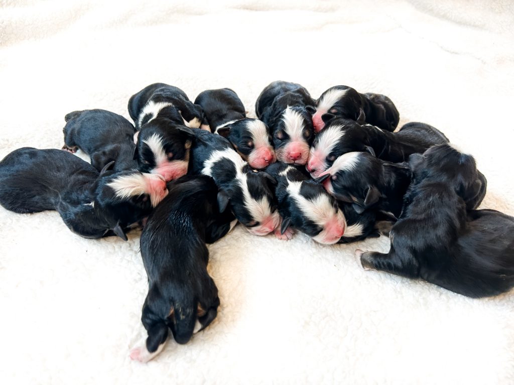 Miso had 13 (reverse F1b Bernedoodle) puppies were born December 10th, 2025 and will be ready to go home February 4th, 2026 (We have puppies available from this litter. (7 female and 6 males)
