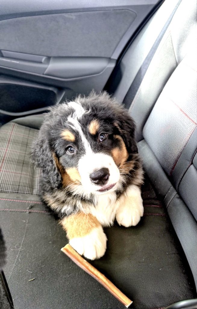 Titan is a fun, spunky Bernese Mountain dog male. He is our up and coming stud and is one very handsome boy. He enjoys lounging around the farm and when he gets excited, he likes to do some bunny hops, which is quite entertaining to watch. He also loves to sit on your feet whenever possible and lean in and “huge you”. He not too thick or thin and has a really nice build overall. His mother was on the smaller side at 90lb but his father is 130lbs. He seems to be happy, no matter where he is or what he’s doing. He enjoys hanging out around our homestead and we just love him!
